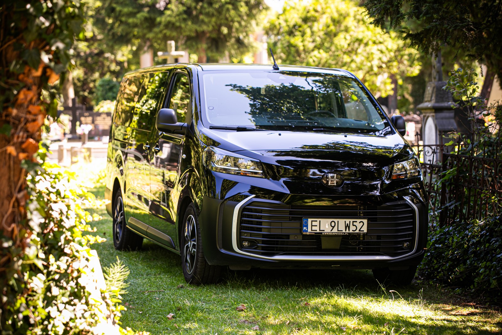 Karawan typu van marki Toyota, w kolorze głębokiej czerni, to połączenie elegancji z praktycznym podejściem do ceremonii pogrzebowej.