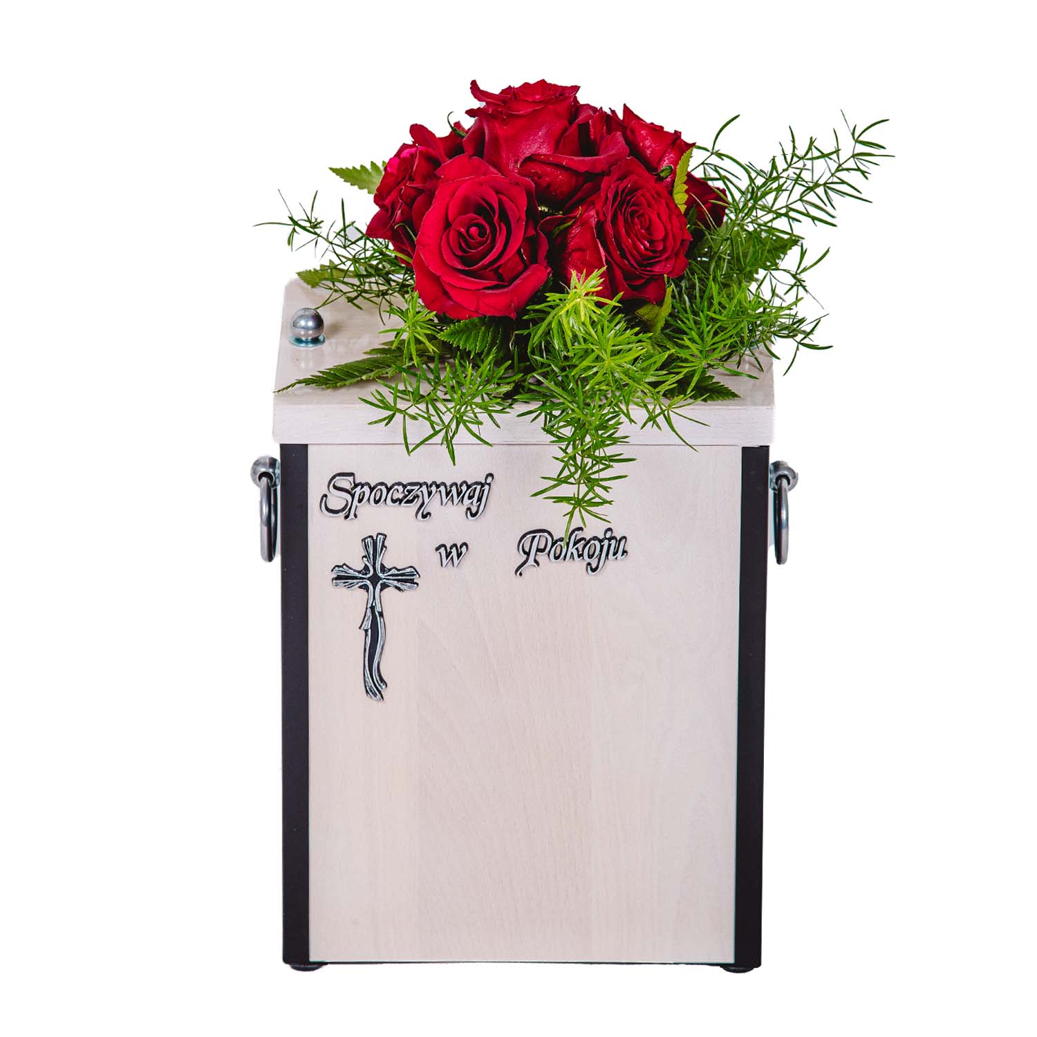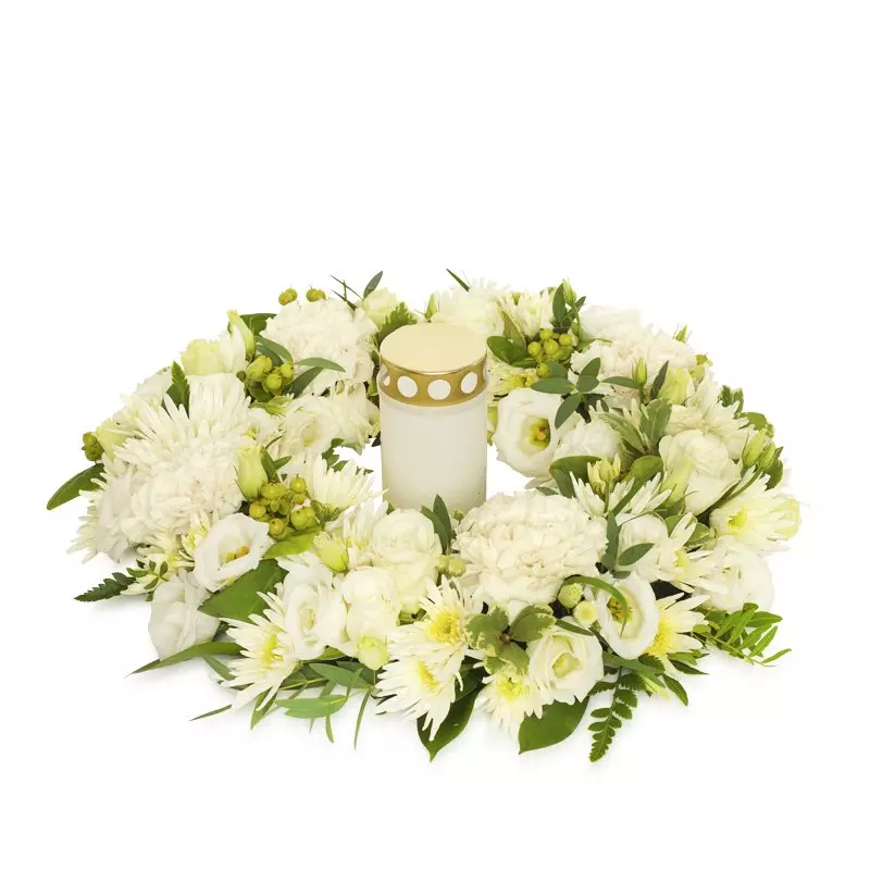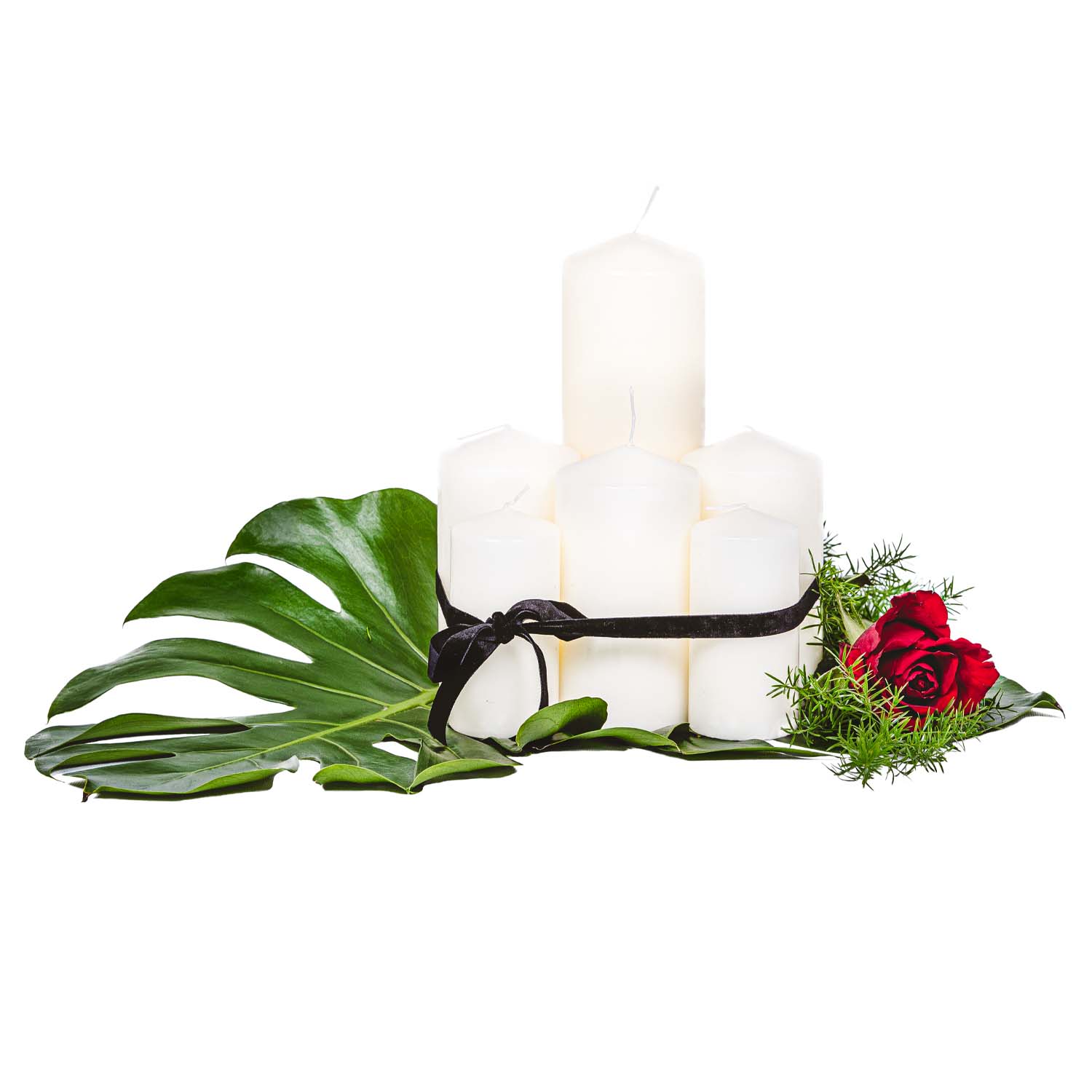 Świece białe + Liście + Wstążka czarna + Róża czerwona