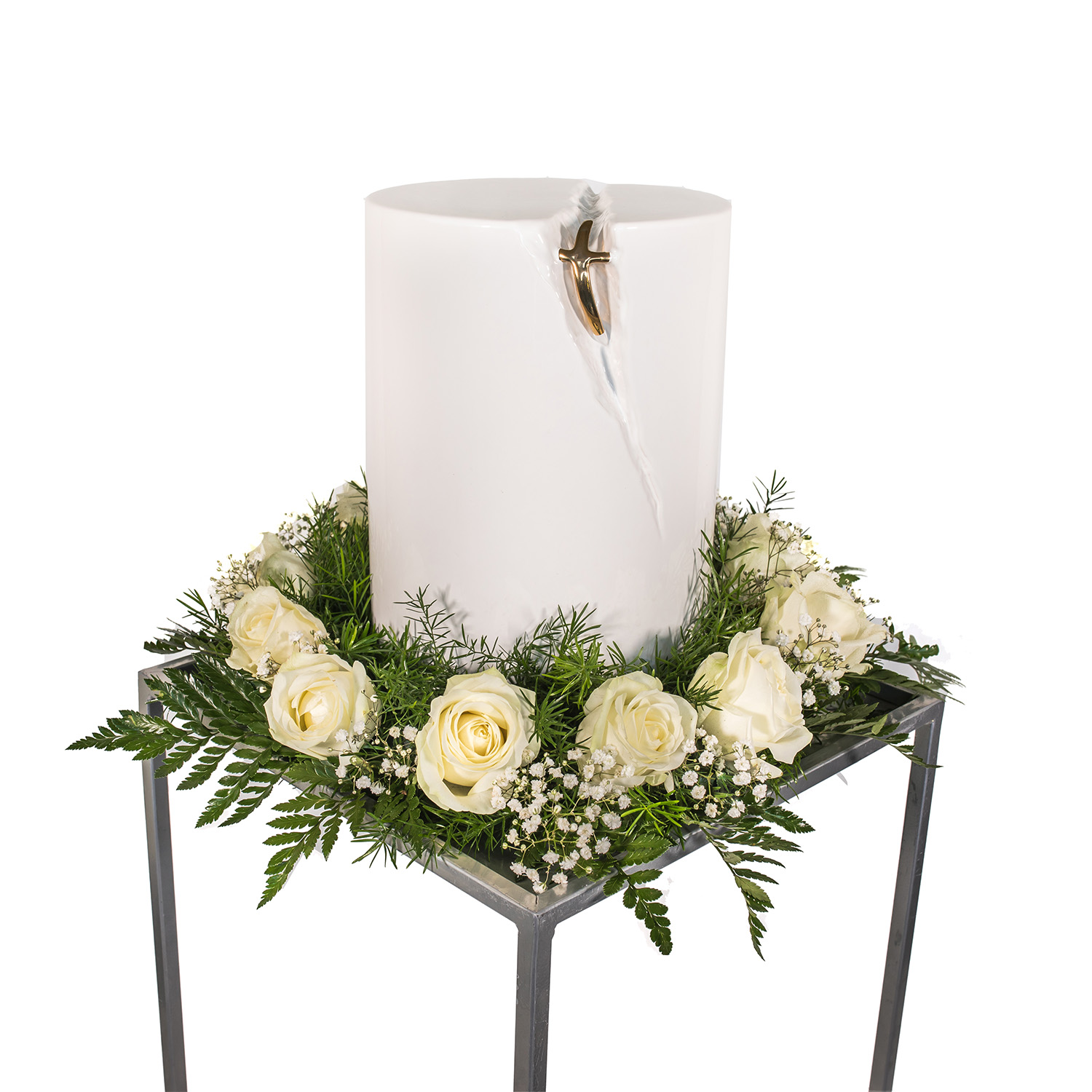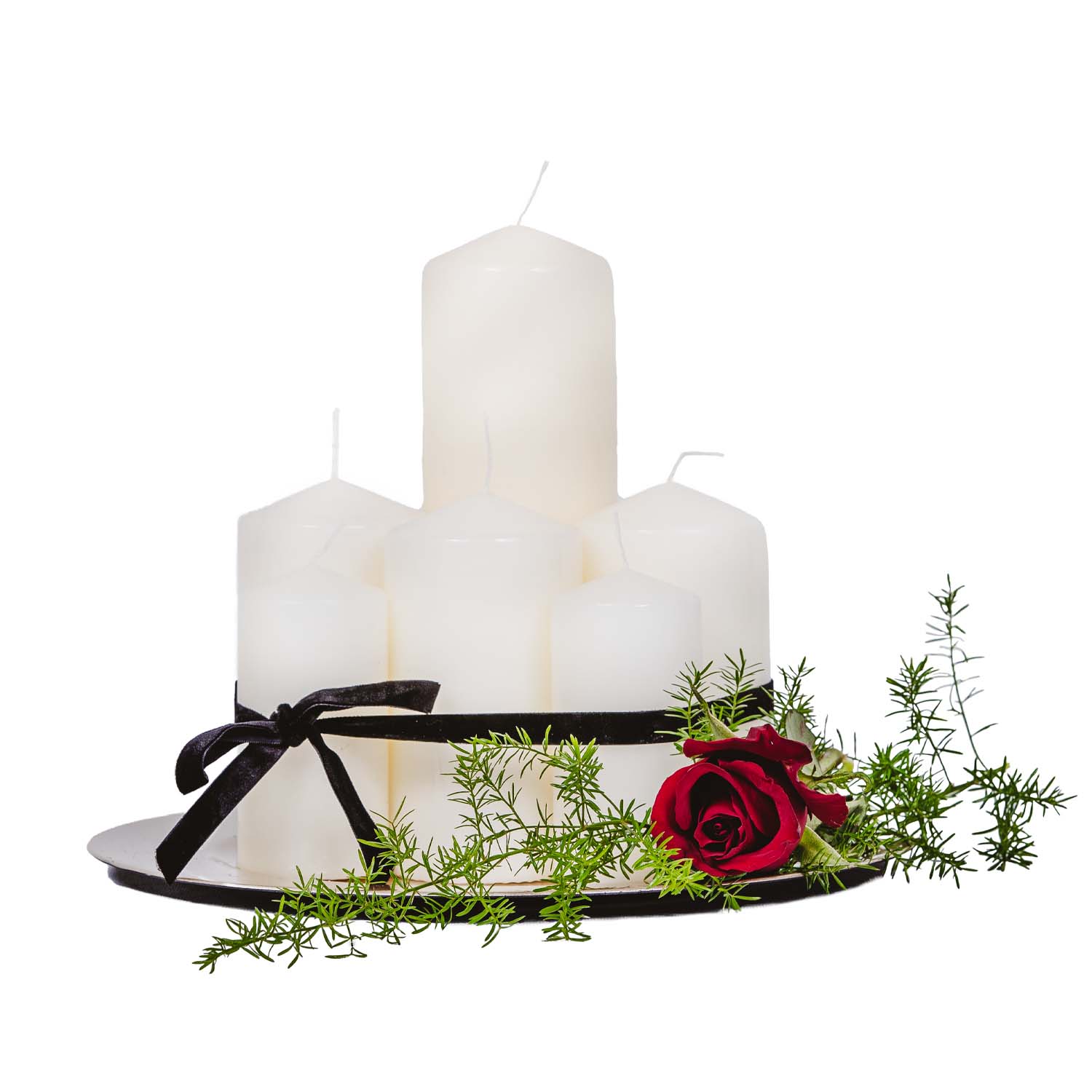 Świece białe + Talerz srebrny + Wstążka czarna + Róża czerwona