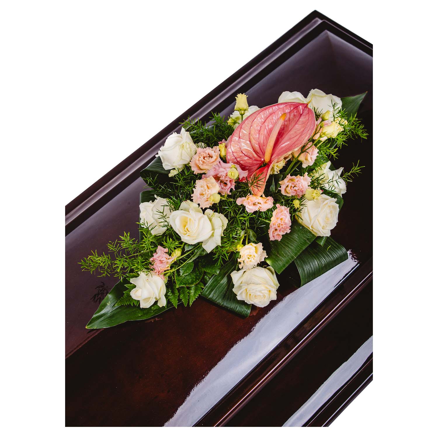 Róża kremowa + Eustoma różowa + Anturium różowe +Asparagus + Liście.