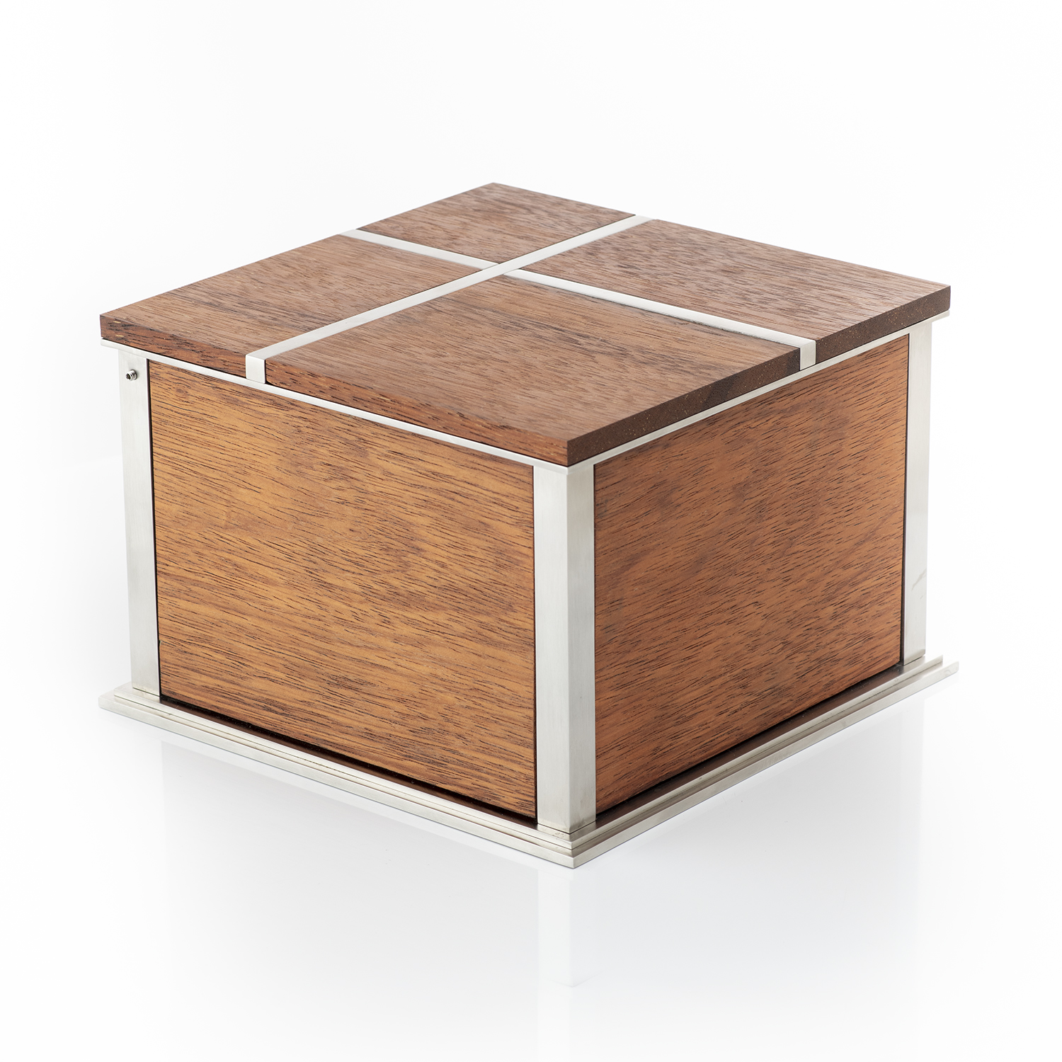 Urny ze stali nierdzewnej stworzone z egzotycznego drewna “merbau”, wyposażone w narożniki i krzyż ze stali nierdzewnej (satynowej).