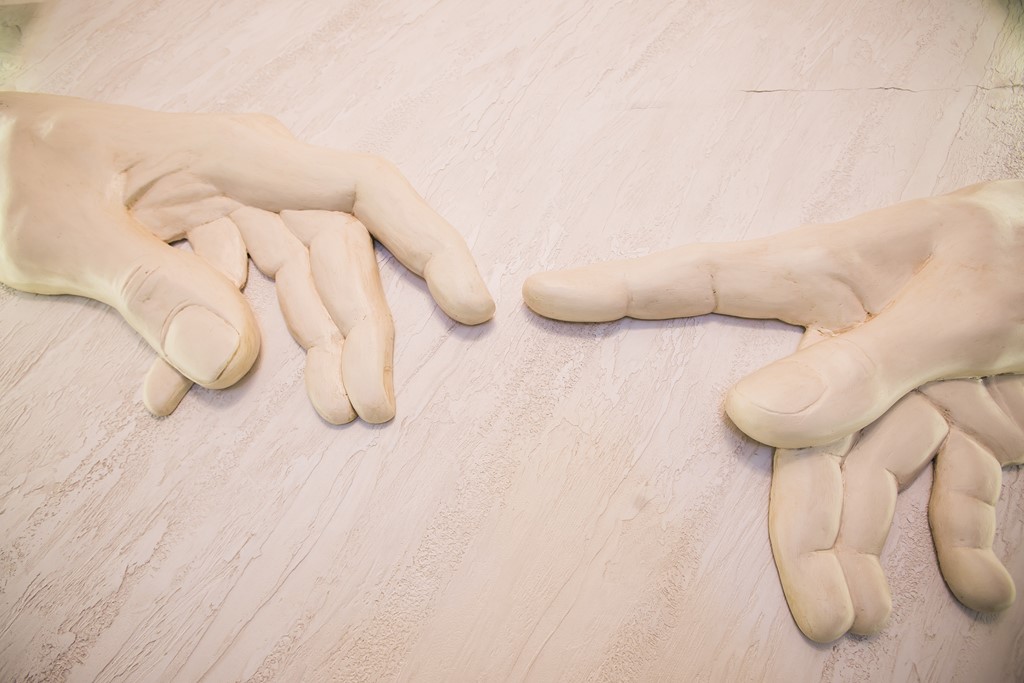 Centralnym elementem przestrzeni jest frontowa ściana zdobiona motywem dwóch dłoni, nawiązującym do fresku „Stworzenie Adama”. Ten symboliczny detal przywołuje ideę bliskości, życia i duchowego kontaktu, podkreślając wyjątkowość momentu pożegnania.